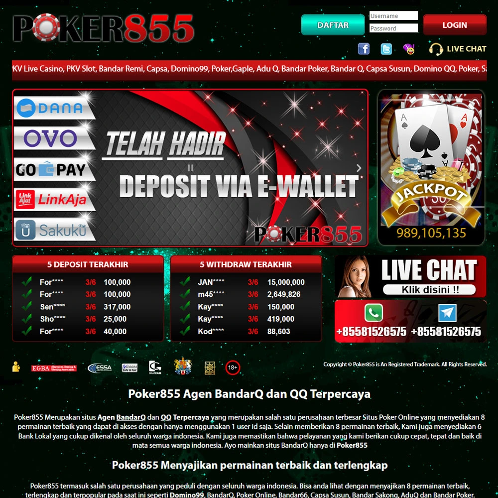 Poker855 adalah agen poker terbaik dengan fasilitas permainan dominoqq, bandarqq serta pokerqq terpercaya yang memberikan banyak bonus untuk semua member.